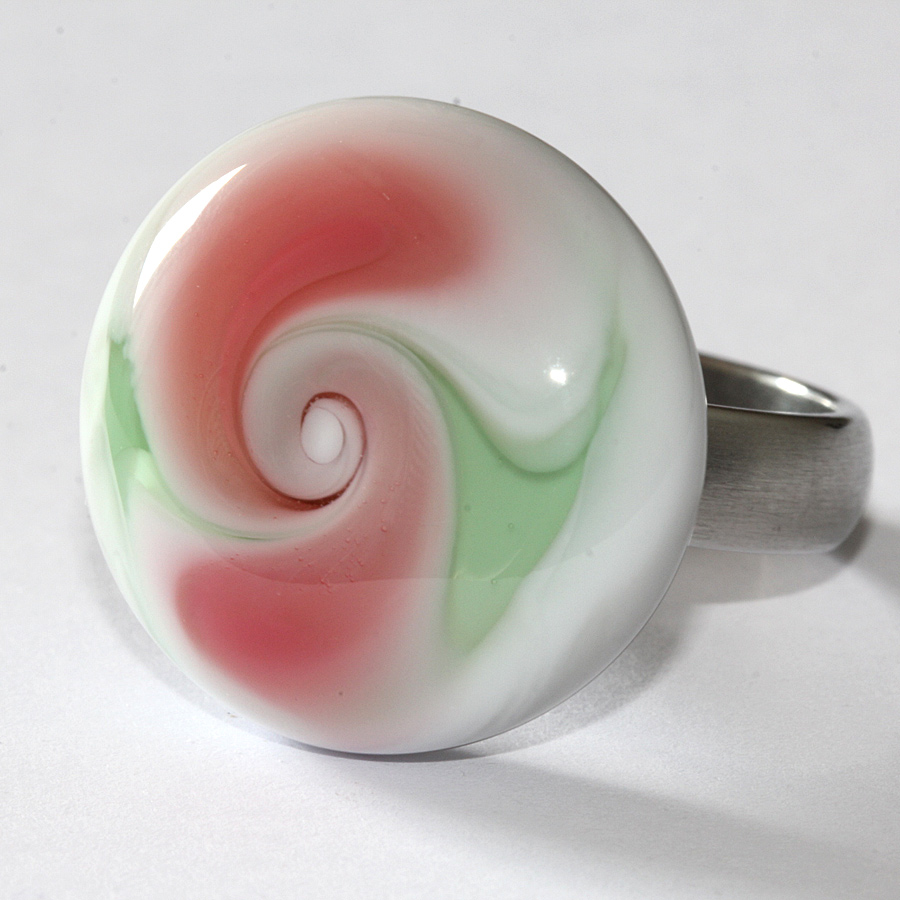 Wechselring-Top (Ringaufsatz) aus Muranoglas mit Fantasiemuster Marmorkringel silbergrau-korallrot. Durchmesser 23 mm, 8 mm hoch. Das Glas wurde direkt auf eine spezielle Edelstahl-Mutter geschmolzen. Glas und Mutter sind untrennbar miteinander verbunden. Das Top wird einfach auf den Gewindezapfen des Grundringes (auch hier im Shop erhältlich) aufgeschraubt.