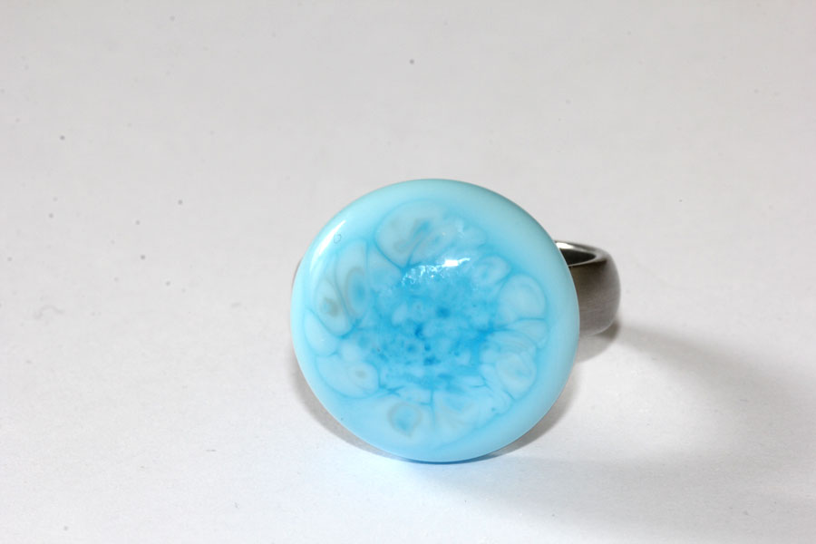 Wechselring-Top (Ringaufsatz) aus Muranoglas. Durchmesser 19 mm, 8 mm hoch. Das Glas wurde direkt auf eine spezielle Edelstahl-Mutter gewickelt. Glas und Mutter sind untrennbar miteinander verbunden. Das Top wird einfach auf den Gewindezapfen des Grundringes (GU00556 auch hier im Shop erhältlich) aufgeschraubt.