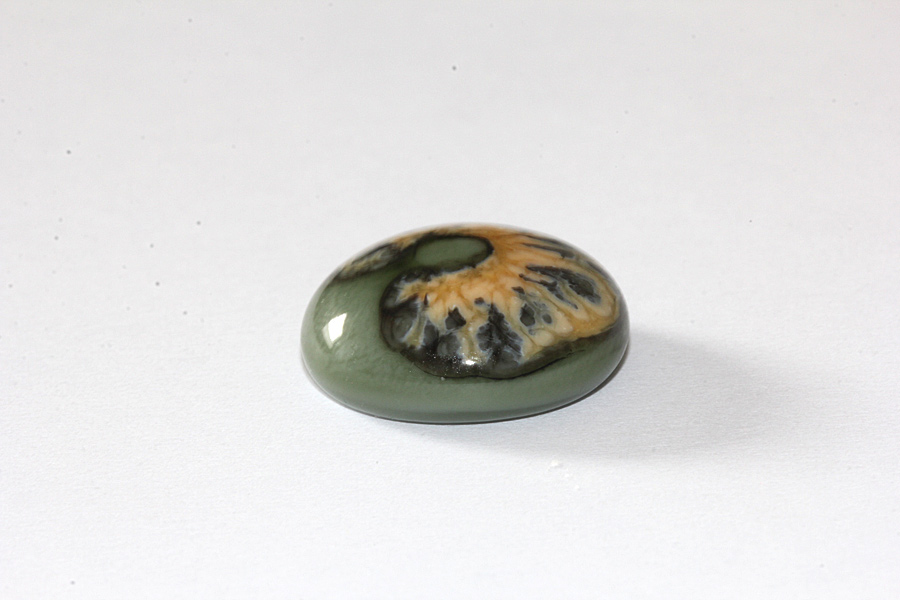 Wechselring-Top (Ringaufsatz) aus Muranoglas mit Fantasiemuster Elfenbein auf schilfgrünem Grund. Durchmesser 18 mm, 8 mm hoch. Das Glas wurde direkt auf eine spezielle Edelstahl-Mutter gewickelt. Glas und Mutter sind untrennbar miteinander verbunden. Das Top wird einfach auf den Gewindezapfen des Grundringes (auch hier im Shop erhältlich) aufgeschraubt.