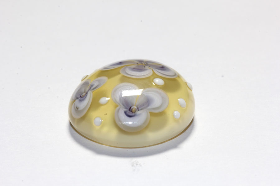 Beeindruckender Wechselring-Top (Ringaufsatz) aus Muranoglas. In Akzentfarbe heller Bernstein mit "schwimmenden" Blüten und augesetzten opaken weißen Punkten. Durchmesser ca. 20 mm, 8 mm hoch. Das Glas wurde direkt auf eine spezielle Edelstahl-Mutter geschmolzen. Glas und Mutter sind untrennbar miteinander verbunden. Das Top wird einfach auf den Gewindezapfen des Grundringes (GU00556 auch hier im Shop erhältlich) aufgeschraubt.