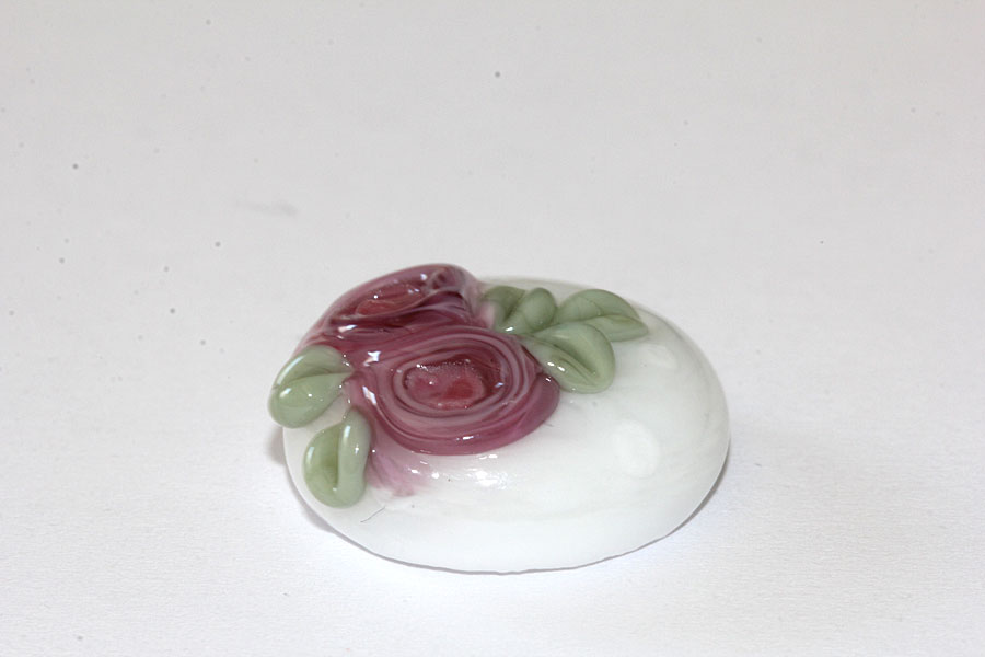 Beeindruckender Wechselring-Top (Ringaufsatz) aus Muranoglas. In Akzentfarbe Weiß. Auf einer weißen Grundperle wurde Klarglas aufgeschmolzen in dem lavendelfarbene Blüten "schwimmen". Opake weiße Tupfen auf der Oberfläche.